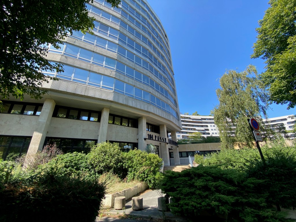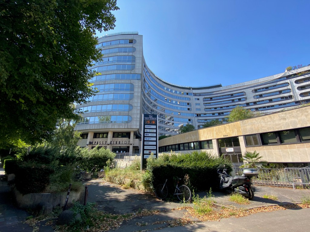 En arrivant au 104 avenue du Président Kennedy, ce qui frappe au premier coup d’œil c’est une sensation de prolongement de la Maison de la Radio et de la Musique située à proximité. Un immeuble tout en courbures avec néanmoins un ensemble moins imposant et des espaces verts un peu plus mis en avant. Comme une continuité marquée par sa singularité. Le nom de cet immeuble, 104 Passy Kennedy, affiché en caractères types Art déco semble ajouter une touche de chic et de fonctionnalité au lieu.